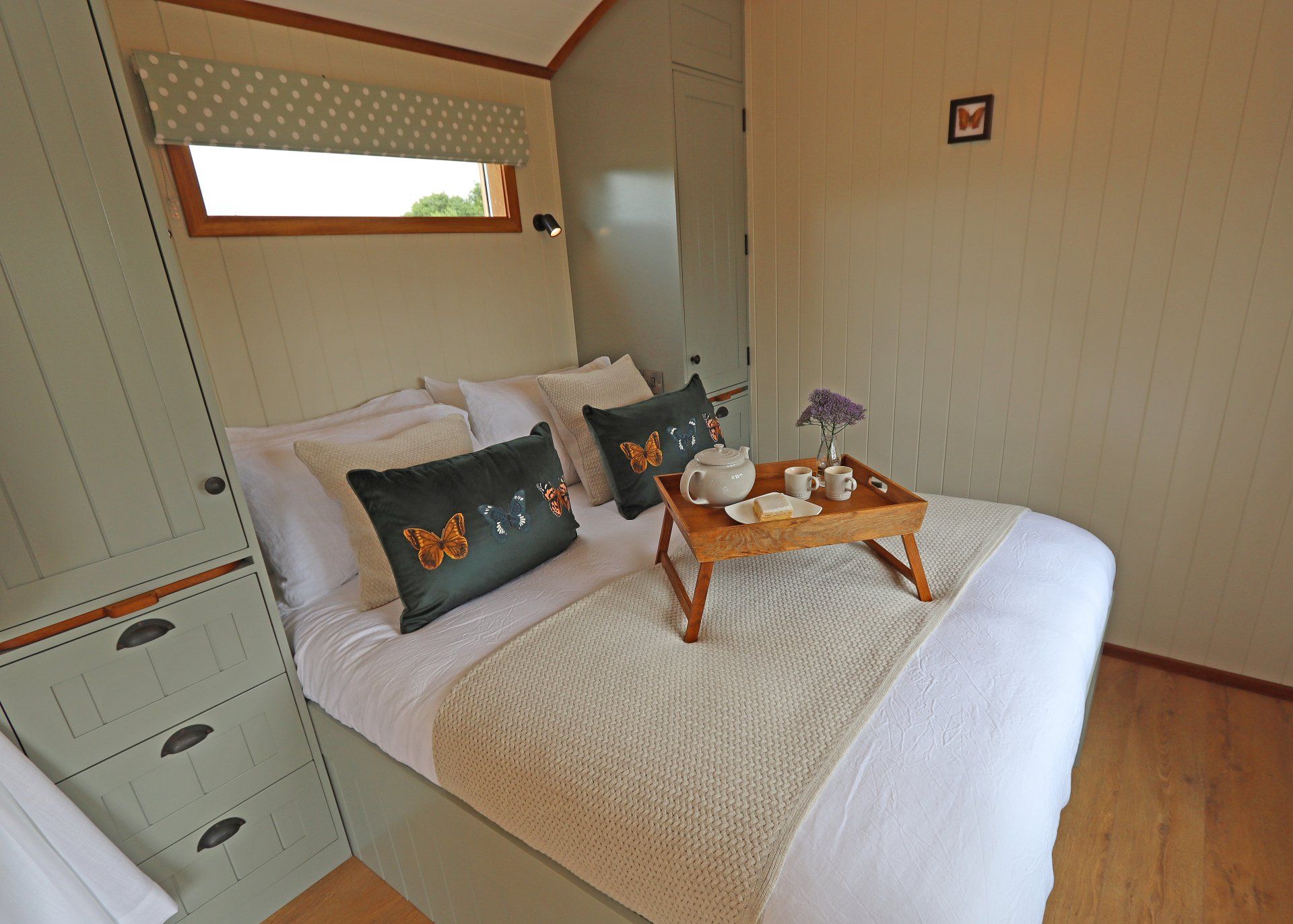 Cwch Gwenyn is a warm and cosy little hut nestled away in the corner of the site. With views over rolling hills and flourishing farmland to the East and the Brecon Beacons.