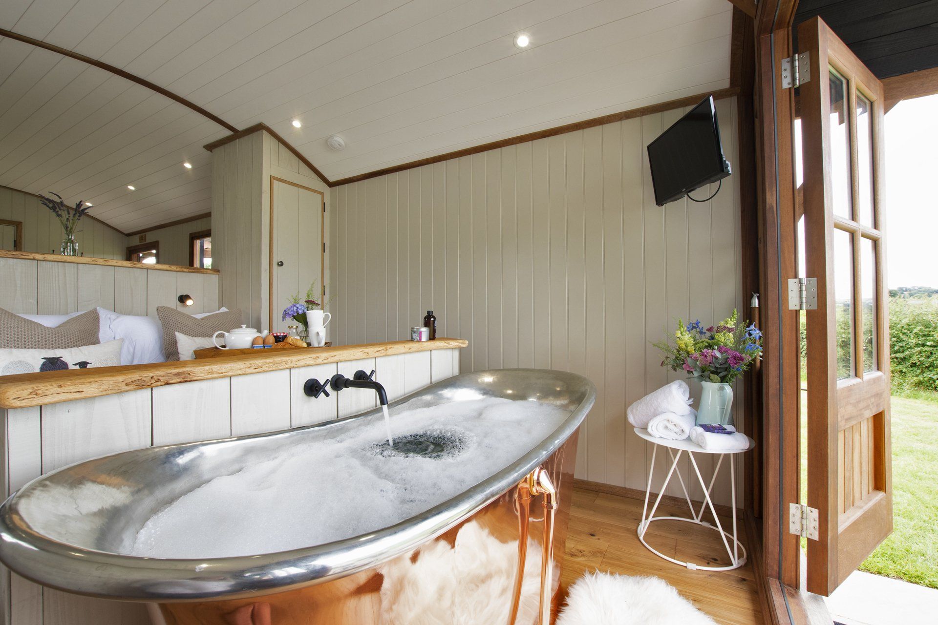 Dafad Du is the Welsh word for black sheep. Situated in the foothills of the Black Mountain range this luxury hut sits peacefully in its countryside location with gorgeous views down the Wye Valley and away to the Brecon Beacons. This beautifully designed space and glorious location create the perfect setting for a romantic glamping escape.